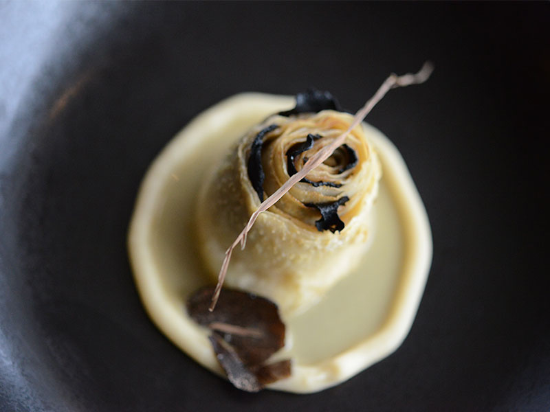Raviole de légumes sans pâte, fricassée de cèpes des Monts de la Madeleine, escargots de chez Benjamin, parfum de plantes des « Pères Chartreux »